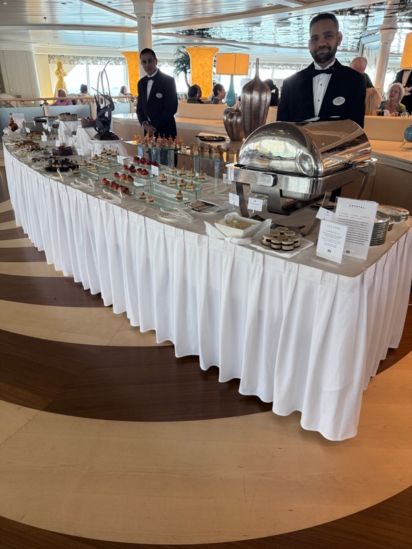 One thing we noticed in contrast to our cruises on Viking, the other passengers are not as friendly as the ones on Viking. We really noticed this when we went to dinner and asked to be seated at a larger table than just for the two of us. The head waiter discouraged us from that, saying that we wouldn’t want to be sitting at a table for six people and be the only two people sitting at the table. On our Viking cruises, we would always ask to be seated at a larger table and met many people that way.