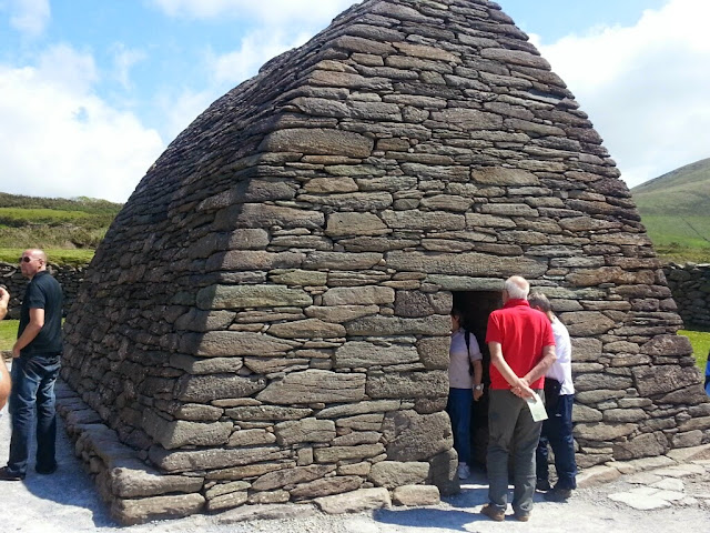 Today, under perfect conditions, we drove the Dingle penninsula. I think it is one of the most scenic parts of Ireland because the road follows the rugged coastline so we saw the blue ocean on the left side while emerald green hills cascaded down the hillsides on the right side. The hills are irregularly divided by stone fences and are dotted with white sheep.